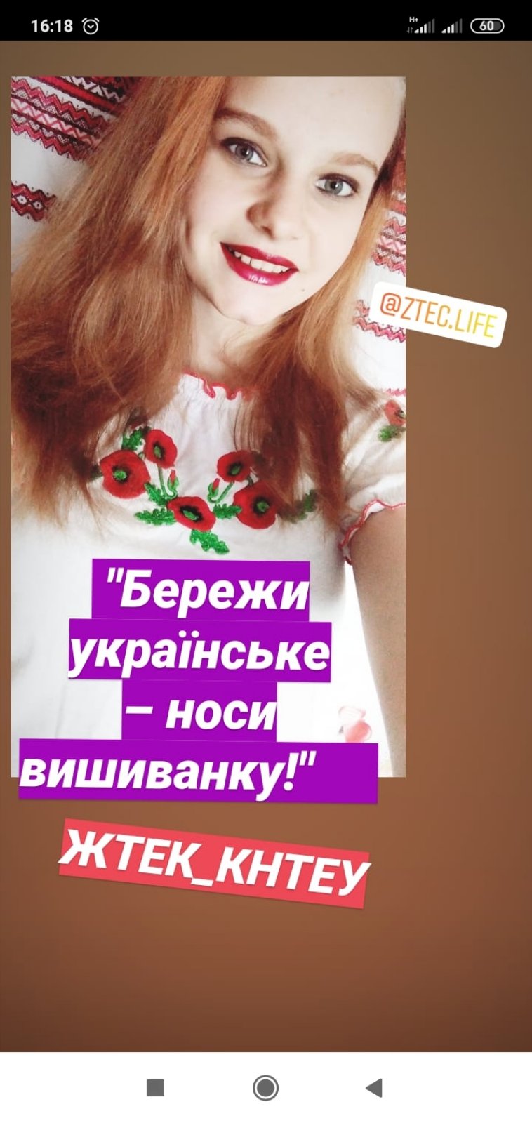 Студентство коледжу долучилося до челенджу до Дня вишиванки. Для участі студенти опубліковували фото або ж селфі у вишиванці на своїй сторінці з хештегом #День вишиванки-2020 в ЖТЕК КНТЕУ.