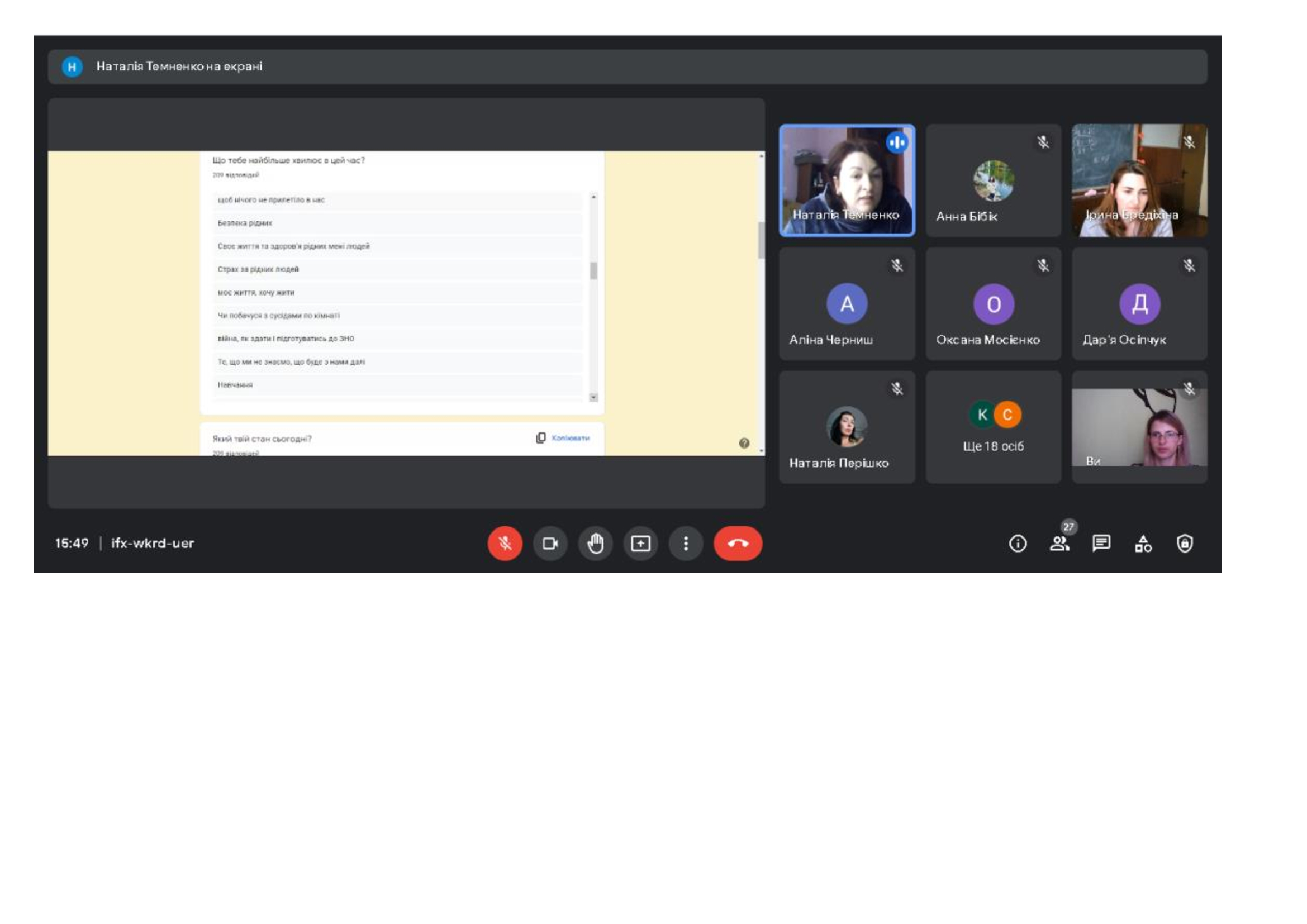 В рамках онлайн-засідання практичним психологом надано лайфлахи як уникнути втоми та почуватись краще, а також проаналізовано результати анкетування "Студентство в умовах війни".