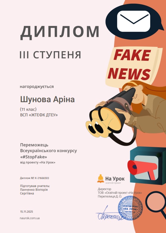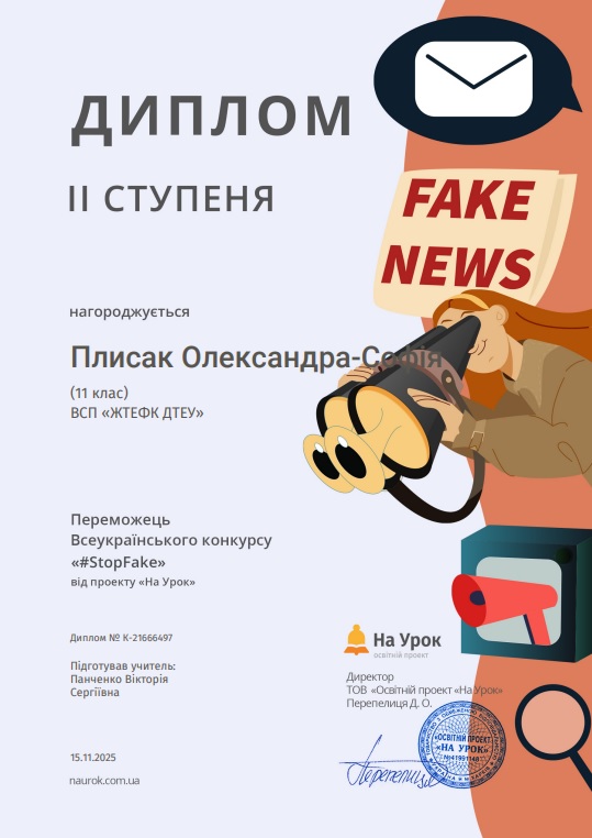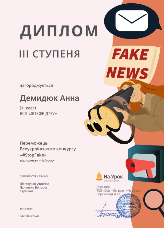 До Всесвітнього тижня медіа та інформаційної грамотності Маємо чудову й надзвичайно важливу новину — студенти ІІ курсу ОПП Маркетингова діяльність, ОПП Товарознавство у митній справі та ОПП Фінанси і кредит під керівництвом к.і.н. Панченко В.С. здобули перемогу у Всеукраїнському конкурсі “#StopFake”, присвяченому темі медіаграмотності, фактчекінгу та відповідального споживання інформації. Цей конкурс зібрав молодь з усієї країни, яка прагне навчитися критично мислити та орієнтуватися в складному інформаційному середовищі. Наші студенти не лише активно долучилися, а й показали високий рівень підготовки, творчості та аналітичного мислення. Підготовка до конкурсу стала справжнім освітнім процесом. До Всесвітнього тижня медіа та інформаційної грамотності студенти взяли участь у тренінгу, організованому викладачем Панченко В.С., який включав цікавий інтерактив: — практичні завдання на розпізнавання фейкових новин та маніпуляцій; — ігрові вправи, що моделювали реальні ситуації з медіапростору; — аналіз заголовків, світлин та інформаційних прийомів; — знайомство з базовими техніками фактчекінгу; — роботу зі зрозумілими прикладами, мемами та короткими відео. Здобувачі освіти з ентузіазмом включилися в процес, активно обговорювали завдання, наводили власні приклади та вчилися ставити уточнювальні запитання — саме ті, які допомагають уникати інформаційних пасток. Участь у тренінгах допомогла напрацювати знання і навики для участі у конкурсі. Конкурс “#StopFake” мав на меті показати молоді, що медіаграмотність — це не складно, а необхідно. У межах участі студенти: — досліджували різні типи дезінформації; — вивчали механізми створення фейкових наративів; — аналізували вплив соцмереж на формування громадської думки; — знайомилися з історією розвитку інформаційного суспільства та причинами його вразливості до маніпуляцій. ПЕРЕМОГА — закономірний результат їхньої злагодженої роботи, креативності та відповідального ставлення до теми. Наші студенти довели, що молодь може бути активним захисником інформаційної безпеки, здатною викривати фейки й допомагати іншим орієнтуватися у потоках інформації. Студенти відзначили, що участь у конкурсі допомогла їм прокачати навички критичного мислення, навчила працювати з джерелами, перевіряти факти й відповідально ставитися до власної інформаційної поведінки. Ми щиро пишаємося нашими переможцями й дякуємо всім, хто підтримував їх на цьому шляху! Разом формуємо покоління молоді, здатне мислити свідомо й відповідально.