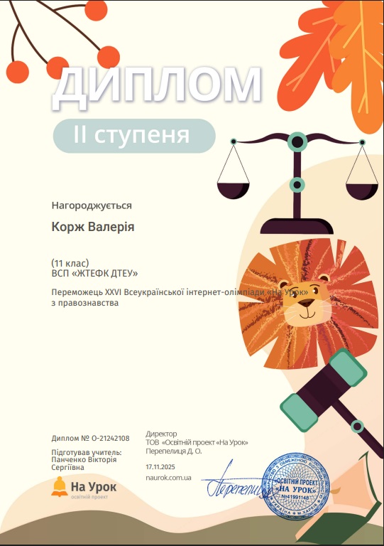 З гордістю повідомляємо про блискучі результати студентів І–ІІ курсів, які під керівництвом к.і.н. Панченко Вікторії Сергіївни взяли активну участь у XXVI Всеукраїнській інтернет-олімпіаді «На Урок» та здобули численні перемоги з гуманітарних дисциплін. Участь у такому масштабному проєкті стала не лише випробуванням знань, а й важливою складовою розвитку пізнавального інтересу, формування критичного мислення, відповідальності та академічної мотивації майбутніх фахівців. РЕЗУЛЬТАТИ ОЛІМПІАДИ ІСТОРІЯ УКРАЇНИ Участь взяли 24 студенти, серед них: 4 дипломи І ступеня 5 дипломів ІІ ступеня 10 дипломів ІІІ ступеня 5 сертифікатів учасника ПРАВОЗНАВСТВО Участь взяли 35 студентів: 6 дипломів І ступеня 20 дипломів ІІ ступеня 6 дипломів ІІІ ступеня 3 сертифікати учасника ГРОМАДЯНСЬКА ОСВІТА Участь взяли 46 студентів: 23 дипломи І ступеня 11 дипломів ІІ ступеня 10 дипломів ІІІ ступеня 2 сертифікати учасника МИСТЕЦТВО Участь взяли 111 студентів: 2 дипломи ІІ ступеня 17 дипломів ІІІ ступеня 92 сертифікати учасника АБСОЛЮТНІ ПЕРЕМОЖЦІ (100/100 БАЛІВ) Особлива гордість — четверо студентів, які набрали максимум балів і не допустили жодної помилки: Олійник Дмитро (П-24) — громадянська освіта Саух Олександра (П-24) — громадянська освіта Діденко Катерина (П-24) — громадянська освіта Фабрична Дарина (ФК-11) — історія України Такий результат — приклад зосередженості, відповідальності та щирого інтересу до обраної дисципліни. УЧАСТЬ НАШИХ СТУДЕНТІВ В ІНТЕРНЕТ-ОЛІМПІАДІ — ЦЕ: активна популяризація знань із гуманітарних дисциплін; формування вміння вчитися самостійно й мислити критично; розвиток академічної культури та відповідального ставлення до навчання; підтримання мотивації й пізнавального інтересу майбутніх фахівців; практичний досвід участі у всеукраїнських освітніх ініціативах без жодних фінансових бар’єрів. Залучення студентів у такі інтелектуальні змагання сприяє їхньому особистісному зростанню, розширенню кругозору та впевненішому відчуттю власних можливостей. ВИСЛОВЛЮЄМО ПОДЯКУ Щиро дякуємо організаторам освітньої платформи «На Урок» за можливість безкоштовно долучитися до такого масштабного й значущого для освітньої спільноти заходу. Ваша діяльність підтримує розвиток молоді, мотивує до знань і відкриває рівні можливості для всіх учасників освітнього процесу. Вітаємо всіх студентів та їх наукового керівника з високими результатами та перемогами! Бажаємо нових успіхів, натхнення й подальших досягнень у науково-освітньому просторі України!