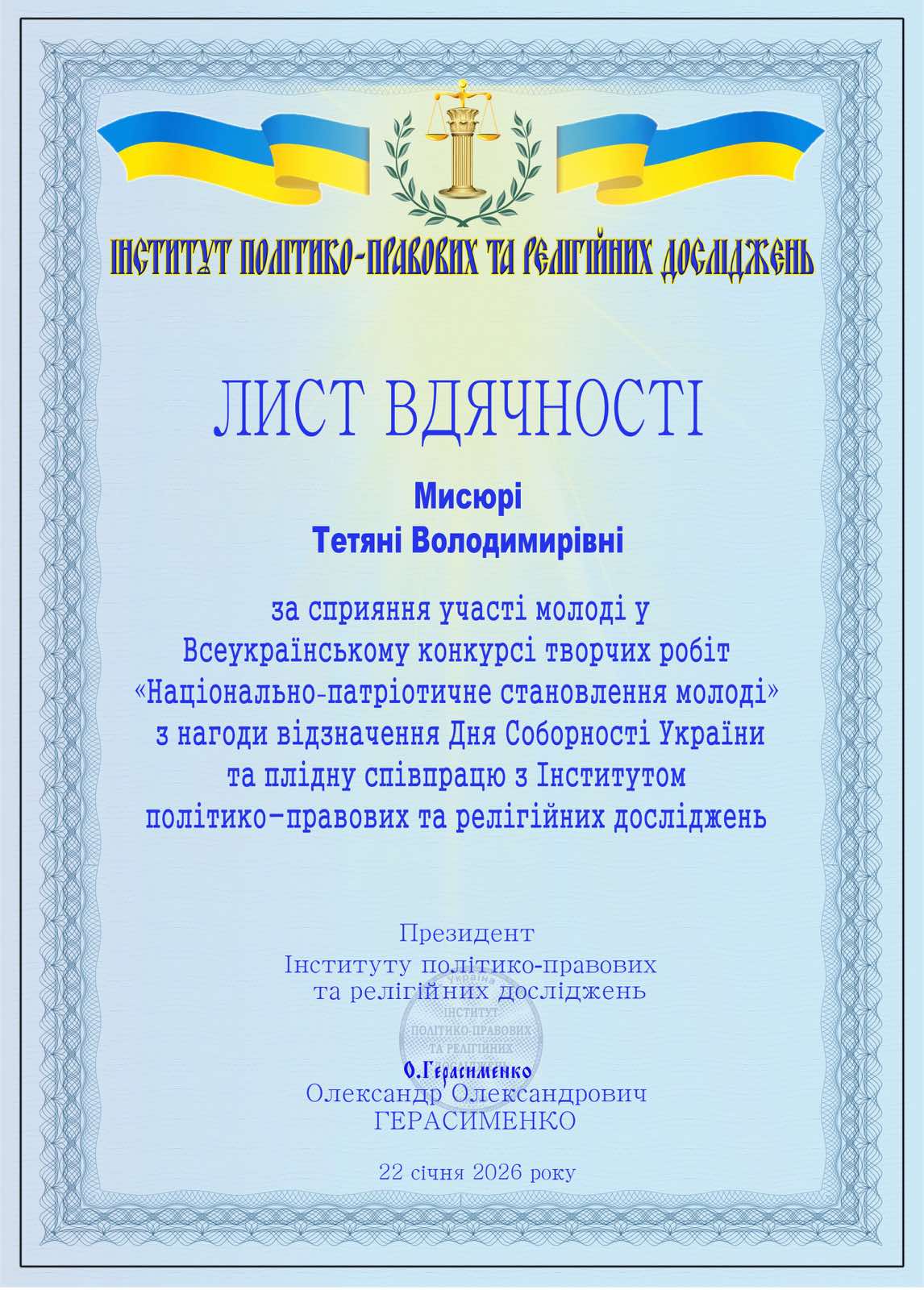 До Дня Соборності України підбито підсумки Всеукраїнського конкурсу «Національно-патріотичне становлення молоді», організованого Інститутом політико-правових та релігійних досліджень. У конкурсі взяли участь 25 368 конкурсантів з усієї України, що є переконливим свідченням його високого рівня, суспільної значущості та всеукраїнського масштабу. Приємно відзначити, що студенти нашого коледжу спеціальності 076 Підприємництво та торгівля освітньо-професійної програми Інформаційна діяльність підприємства групи ІДП-16 (викладач Мисюра Т.В.) гідно представили навчальний заклад і здобули призові місця, продемонструвавши активну громадянську позицію, національну свідомість і творчий потенціал: Шевченко Єлизавета Артурівна – диплом І ступеня; Неселовський Ілля Васильович – диплом ІІ ступеня; Стьопкіна Юлія Володимирівна – диплом ІІІ ступеня; Бондарчук Вікторія Сергіївна – диплом ІІІ ступеня. Організатори конкурсу також відзначили ВСП«Житомирський торговельно-економічний фаховий коледж ДТЕУ» подякою за системну роботу з формування громадянської свідомості, підтримку студентських наукових ініціатив та розвиток національно-патріотичних цінностей у молодіжному середовищі. Щиро вітаємо наших студентів з вагомими досягненнями! Бажаємо подальших успіхів, нових перемог і натхнення!