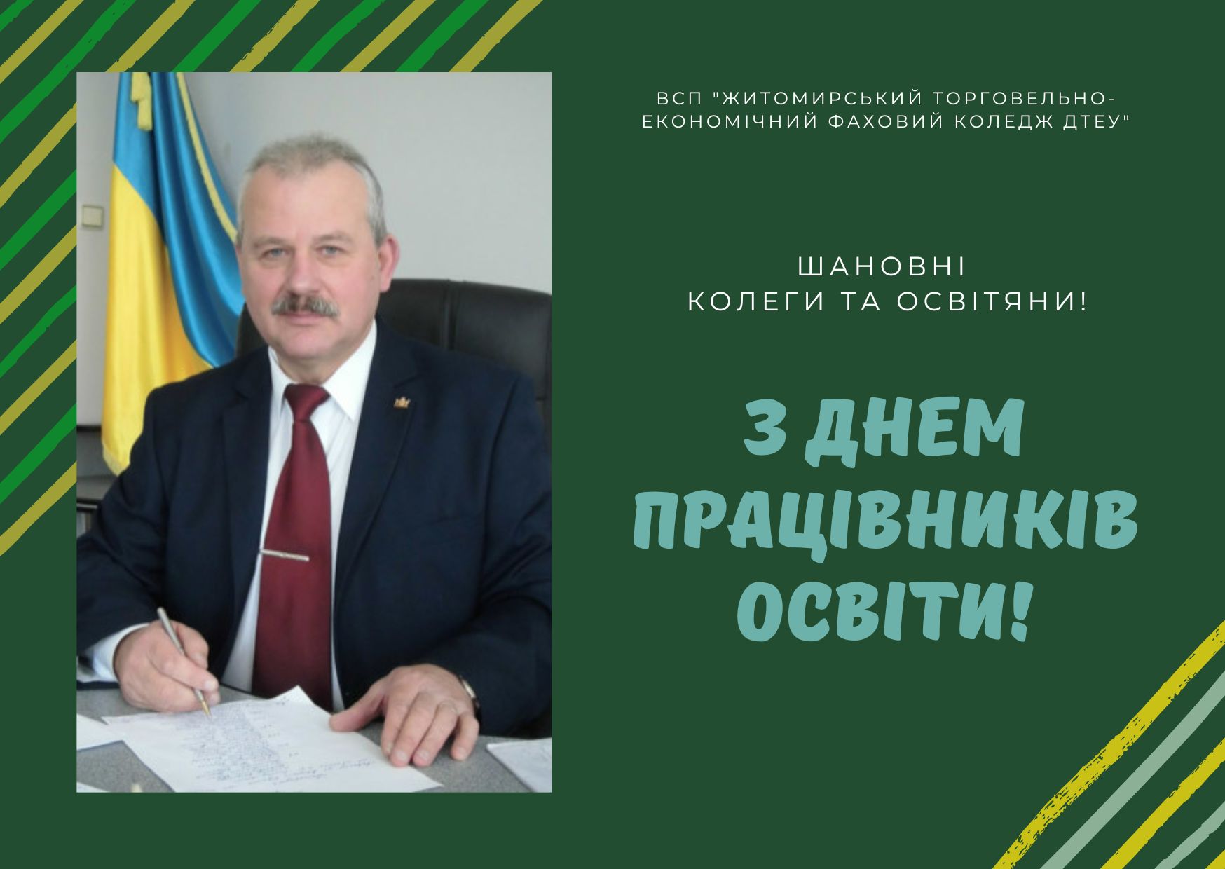 Привітання директора коледжу з нагоди Дня працівників освіти. Шановні колеги та освітянська родино! Щиро вітаю колектив коледжу та всю освітянську спільноту з прийдешнім професійним святом – Днем працівників освіти України! Високий авторитет ВСП " Житомирського торговельно-економічного фахового коледжу ДТЕУ" як потужного інноваційного освітнього центру забезпечується щоденною наполегливою працею викладачів, які вкла – далі...