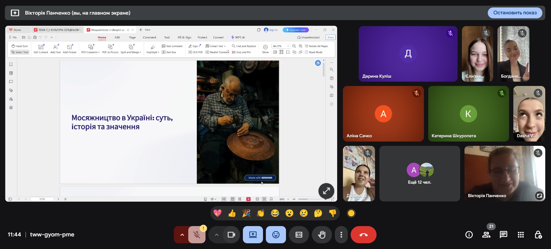 У рамках педагогічного марафону «Знай про UA» від МАН та з метою глибшого опанування навчальною дисципліною Історія світової та української культури 23 вересня 2025 р. викладачем Панченко В.С. для груп ГРС2 і МД11 були проведені інтерактивні заняття на тему: "Мисленнєва реконструкція культурної спадщини: мосяжництво, ліжникарство, ложкарство". Метою було навчити учасників дивитися на українські ремесла (мосяжництво, ліжникарство, ложкарство) через призму критичного мислення та спонукати аналізувати їхнє походження, шукати нові шляхи застосування та створювати власні, сучасні твори, які базуються на традиціях. У ході роботи студенти пробували досліджувати історію виникнення та становлення, технік та символіки давніх ремесел, а також їх сучасне переосмислення, працюючи індивідуально та в групах, виконуючи завдання, що розвивають асоціативне та креативне мислення, навички командної роботи. Заняття містило вікторини, мозкові штурми, творчі вправи та використання сучасних цифрових інструментів (Mentimeter, Quizlet, Canva тощо). Спочатку здобувачі освіти подивились коротке відео про сучасний стан та важливість народних ремесел для розвитку української національної ідентичності та економіки регіонів; обговорили його; пригадали, які вони знають народні ремесла через розгадування тематичних ребусів. Поділились своїм досвідом знайомства з народними ремеслами (чим займаються самі на дозвіллі чи їх рідні - вишивка, ложкарство, лозоплетіння, різьблення по дереву абощо). Потім здійснили віртуальну подорож з інтерактивним дороговказом у застосунку GENIALLY, де кожна зупинка розповідала про народних майстрів, спонукала створювати власні візуальні асоціації та орнаменти, розв'язувати ребуси, а також обговорювати як давні техніки та орнаменти можна застосувати в сучасному світі. Насамкінець присутні мали можливість закріпити власні знання і отримані навики під час проходження тематичної вікторини у Кахуті та поміркувати над проблемними питаннями: Як мосяжництво, ліжникарство та ложкарство сприяють формуванню культурної ідентичності в сучасному українському суспільстві? Як глобалізація змінює традиційні техніки народних ремесел, і які наслідки це має для культурної спадщини? Заняття пройшло активно, у атмосфері дружньої взаємодії, постійної залученості всіх його учасників та мало вагоме освітнє значення.