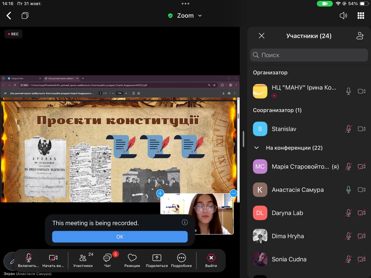 31 жовтня 2025 року студенти освітньо-професійних програм «Правознавство» та "Правоохоронна діяльність" взяли участь у Всеукраїнській учнівській конференції з історії «СпІльноСТОРІЯ-2025», що проходила онлайн на платформі Zoom. Захід об’єднав молодих дослідників із різних куточків України, які представляли власні наукові розвідки у чотирьох секціях: «Постаті минулого: люди як творці ідей, культур та епох»; «Особистість і війна»; «Міфологізація і героїзація історичних осіб: проблеми пошуку об’єктивності»; «Образи історичних постатей в культурі та мистецтві». Наш навчальний заклад представили студенти, які виступили з ґрунтовними та змістовними доповідями. Муць Ілля (П-24, наук.кер. Панченко В.С.) у роботі «Середньовічні університети: роль у розвитку юридичних ідей» розкрив значення перших європейських університетів у формуванні основ права, наголосив на впливі Болонської школи на розвиток юридичної освіти. У ході обговорення студент вдало відповів на запитання членів оргкомітету щодо порівняння університетських статутів середньовіччя та сучасних академічних принципів. Мартинюк Надія (П-24; наук.кер. Панченко В.С.) у своїй доповіді «Розвиток прав людини в середньовічних юридичних системах» проаналізувала джерела середньовічного права — від «Великої хартії вольностей» до міських кодексів, акцентувавши увагу на поступовому становленні ідеї свободи особистості. Її виступ викликав жваву дискусію, під час якої учасники обговорювали еволюцію правових норм і їхнє відображення в сучасних конституційних актах. Лазарєва Віта (П-23; наук.кер. Панченко В.С.) представила роботу «Розвиток ідеї національної держави у середньовічній Європі», де розкрила історичні передумови формування національної ідентичності у Франції, Англії та Чехії. Члени журі відзначили логічність структури, аргументованість висновків і високий рівень володіння історичним матеріалом. Кондратюк Евеліна (П-23; наук.кер. Панченко В.С.) виступила в секції «Особистість і війна» з темою «Моральні дилеми особистостей у війні в середньовічній Європі». Її дослідження торкалося питань честі, вірності, вибору між обов’язком і гуманністю в часи воєнних конфліктів. Евеліна отримала схвальні відгуки за вміння поєднати історичний матеріал із сучасними морально-етичними проблемами. Карпюк Анастасія (П-23; наук. кер. Панченко В. С.) представила ґрунтовну доповідь «Роль християнства у формуванні державних ідеалів Середньовічної Європи». У своєму виступі студентка розкрила вплив християнської ідеології на становлення європейських державних структур, наголосила на поєднанні духовних і політичних чинників у розвитку суспільства. Під час обговорення Анастасія впевнено відповіла на запитання членів оргкомітету щодо взаємодії церкви і влади, виявивши вміння критично аналізувати джерела та порівнювати історичні моделі. Гомелько Дарина та Шульга Марина (ПД-3; наук. кер. Мисюра Т. В.) виступили з дослідженням «Міфологізація та героїзація історичних постатей в українській історії: пошук об’єктивності». Їхня спільна робота викликала особливу зацікавленість учасників конференції, адже студентки порушили актуальну тему — як формуються образи національних героїв у свідомості народу. Вони проаналізували приклади з історії України, показали різницю між історичними фактами та їх