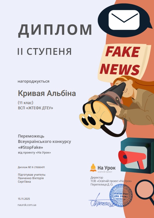 До Всесвітнього тижня медіа та інформаційної грамотності Маємо чудову й надзвичайно важливу новину — студенти ІІ курсу ОПП Маркетингова діяльність, ОПП Товарознавство у митній справі та ОПП Фінанси і кредит під керівництвом к.і.н. Панченко В.С. здобули перемогу у Всеукраїнському конкурсі “#StopFake”, присвяченому темі медіаграмотності, фактчекінгу та відповідального споживання інформації. Цей конкурс зібрав молодь з усієї країни, яка прагне навчитися критично мислити та орієнтуватися в складному інформаційному середовищі. Наші студенти не лише активно долучилися, а й показали високий рівень підготовки, творчості та аналітичного мислення. Підготовка до конкурсу стала справжнім освітнім процесом. До Всесвітнього тижня медіа та інформаційної грамотності студенти взяли участь у тренінгу, організованому викладачем Панченко В.С., який включав цікавий інтерактив: — практичні завдання на розпізнавання фейкових новин та маніпуляцій; — ігрові вправи, що моделювали реальні ситуації з медіапростору; — аналіз заголовків, світлин та інформаційних прийомів; — знайомство з базовими техніками фактчекінгу; — роботу зі зрозумілими прикладами, мемами та короткими відео. Здобувачі освіти з ентузіазмом включилися в процес, активно обговорювали завдання, наводили власні приклади та вчилися ставити уточнювальні запитання — саме ті, які допомагають уникати інформаційних пасток. Участь у тренінгах допомогла напрацювати знання і навики для участі у конкурсі. Конкурс “#StopFake” мав на меті показати молоді, що медіаграмотність — це не складно, а необхідно. У межах участі студенти: — досліджували різні типи дезінформації; — вивчали механізми створення фейкових наративів; — аналізували вплив соцмереж на формування громадської думки; — знайомилися з історією розвитку інформаційного суспільства та причинами його вразливості до маніпуляцій. ПЕРЕМОГА — закономірний результат їхньої злагодженої роботи, креативності та відповідального ставлення до теми. Наші студенти довели, що молодь може бути активним захисником інформаційної безпеки, здатною викривати фейки й допомагати іншим орієнтуватися у потоках інформації. Студенти відзначили, що участь у конкурсі допомогла їм прокачати навички критичного мислення, навчила працювати з джерелами, перевіряти факти й відповідально ставитися до власної інформаційної поведінки. Ми щиро пишаємося нашими переможцями й дякуємо всім, хто підтримував їх на цьому шляху! Разом формуємо покоління молоді, здатне мислити свідомо й відповідально.