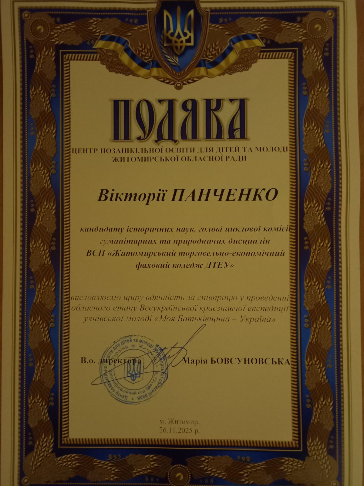 Краєзнавча експедиція «Моя Батьківщина — Україна» вже багато років залишається однією з найбільш дієвих форм: патріотичного виховання; розвитку дослідницьких умінь; формування поваги до історії та культури рідного краю; підтримки активної громадянської позиції молодого покоління; набуття навичок роботи з джерелами, анкетування, усної історії, фотофіксації. Щорічно вона проводиться з метою вдосконалення змісту, форм та засобів виховної роботи на кращих традиціях українського народу, формування гармонійно розвиненої особистості шляхом залучення дітей та молоді до активної діяльності з вивчення історичної та культурної спадщини, природного різноманіття рідного краю, ознайомлення з об’єктами заповідного фонду України. Цьогоріч до суддівства в Обласному етапі Всеукраїнської краєзнавчої експедиції учнівської молоді «Моя Батьківщина — Україна» була залучена Голова Центру науки коледжу, голова Циклової комісії гуманітарних та природничих дисциплін, кандидат історичних наук, викладач-методист Панченко Вікторія Сергіївна. Вона здійснила експертне оцінювання робіт, звертаючи увагу на наукову достовірність, глибину дослідження, структурованість матеріалу, творчу подачу та практичну цінність зібраного учнями контенту. Її участь сприяла об’єктивному, фаховому визначенню найкращих робіт та підтримці юних краєзнавців у їхніх перших кроках у науковий світ. СЕКЦІЯ «З ПОПЕЛУ ЗАБУТТЯ» У цьому напрямі було представлено 8 змістовних робіт, створених школярами з різних куточків нашої області. Тематика вражала глибиною та щирістю пошуку, а саме: дослідження життєвого шляху видатних земляків, які зробили вагомий внесок у розвиток культури, освіти та історії місцевих громад; роботи, присвячені подіям російсько-української війни, у яких школярі уважно зібрали свідчення очевидців, родинні історії, матеріали місцевих архівів; проєкти з вивчення історії населених пунктів, маловідомих фактів їх заснування, розвитку та культурної спадщини. Особливістю цих робіт стала їхня пошукова спрямованість: учні активно використовували власні архіви, сімейні фотоколекції, створювали авторські фото й відеоматеріали, проводили інтерв’ю зі старожилами та учасниками подій. Відчувалась щира зацікавленість молоді у збереженні пам’яті свого краю. СЕКЦІЯ «ІЗ БАТЬКІВСЬКОЇ КРИНИЦІ» До цього напряму було подано 14 яскравих етнографічних досліджень, присвячених культурним традиціям та духовній спадщині мешканців Житомирщини. Учні досліджували: народні звичаї та обряди, що збереглися в різних громадах області; традиційне вбрання, елементи побутової культури, обрядові пісні та фольклор; сакральні споруди, храми, каплички, святині, пов’язані з історією місцевостей; особливості релігійної обрядовості, родинних свят, календарних традицій. Кожна робота вражала увагою до деталей, складеними родовими історіями, прикладами старовинних речей, світлинами та записами усної народної творчості. Учням вдалося показати живу, багатогранну культуру Житомирщини, яка й сьогодні зберігається у родинах і громадах. ЩИРА ПОДЯКА ОРГАНІЗАТОРАМ Висловлюємо щиру подяку організаторам обласного етапу експедиції за запрошення, високий рівень проведення заходу та створення майданчику, де учні можуть виявити свої таланти, презентувати власні відкриття й усвідом