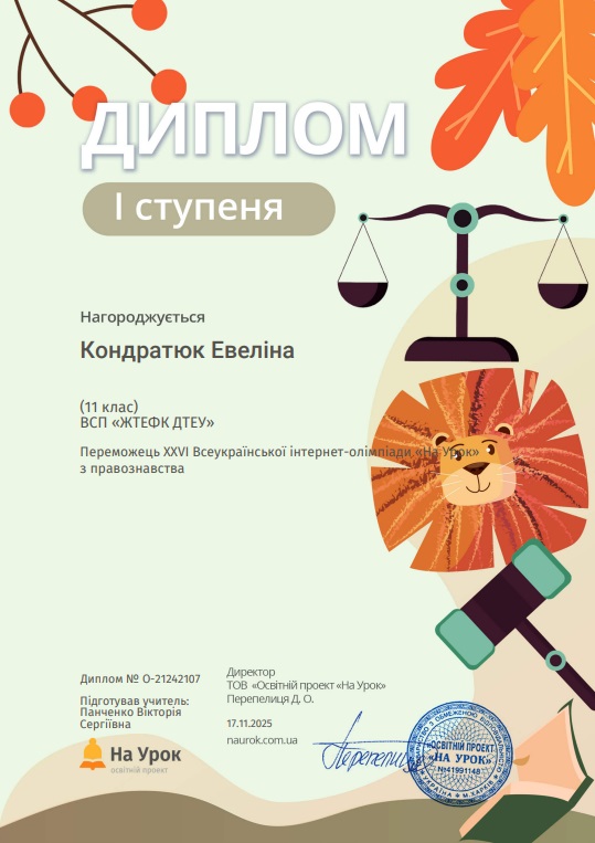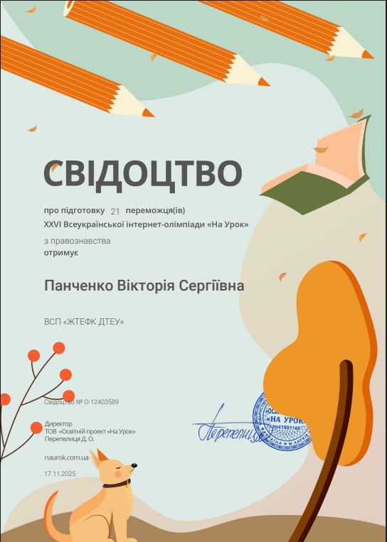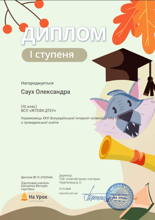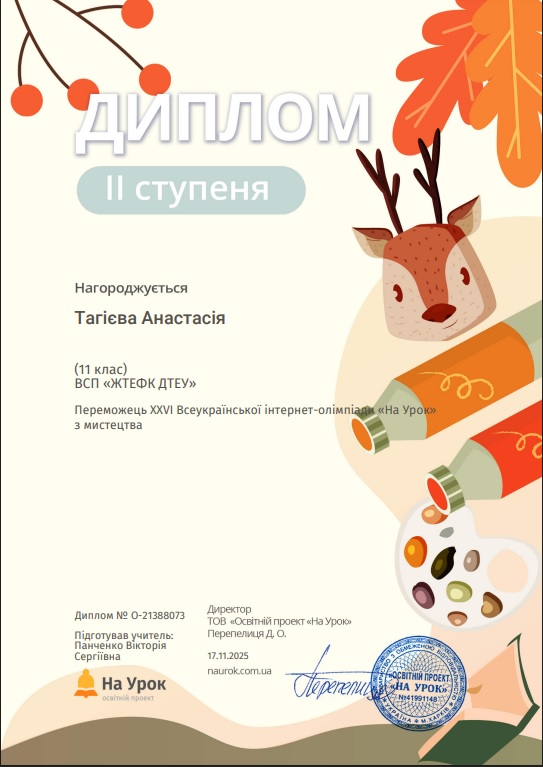 З гордістю повідомляємо про блискучі результати студентів І–ІІ курсів, які під керівництвом к.і.н. Панченко Вікторії Сергіївни взяли активну участь у XXVI Всеукраїнській інтернет-олімпіаді «На Урок» та здобули численні перемоги з гуманітарних дисциплін. Участь у такому масштабному проєкті стала не лише випробуванням знань, а й важливою складовою розвитку пізнавального інтересу, формування критичного мислення, відповідальності та академічної мотивації майбутніх фахівців. РЕЗУЛЬТАТИ ОЛІМПІАДИ ІСТОРІЯ УКРАЇНИ Участь взяли 24 студенти, серед них: 4 дипломи І ступеня 5 дипломів ІІ ступеня 10 дипломів ІІІ ступеня 5 сертифікатів учасника ПРАВОЗНАВСТВО Участь взяли 35 студентів: 6 дипломів І ступеня 20 дипломів ІІ ступеня 6 дипломів ІІІ ступеня 3 сертифікати учасника ГРОМАДЯНСЬКА ОСВІТА Участь взяли 46 студентів: 23 дипломи І ступеня 11 дипломів ІІ ступеня 10 дипломів ІІІ ступеня 2 сертифікати учасника МИСТЕЦТВО Участь взяли 111 студентів: 2 дипломи ІІ ступеня 17 дипломів ІІІ ступеня 92 сертифікати учасника АБСОЛЮТНІ ПЕРЕМОЖЦІ (100/100 БАЛІВ) Особлива гордість — четверо студентів, які набрали максимум балів і не допустили жодної помилки: Олійник Дмитро (П-24) — громадянська освіта Саух Олександра (П-24) — громадянська освіта Діденко Катерина (П-24) — громадянська освіта Фабрична Дарина (ФК-11) — історія України Такий результат — приклад зосередженості, відповідальності та щирого інтересу до обраної дисципліни. УЧАСТЬ НАШИХ СТУДЕНТІВ В ІНТЕРНЕТ-ОЛІМПІАДІ — ЦЕ: активна популяризація знань із гуманітарних дисциплін; формування вміння вчитися самостійно й мислити критично; розвиток академічної культури та відповідального ставлення до навчання; підтримання мотивації й пізнавального інтересу майбутніх фахівців; практичний досвід участі у всеукраїнських освітніх ініціативах без жодних фінансових бар’єрів. Залучення студентів у такі інтелектуальні змагання сприяє їхньому особистісному зростанню, розширенню кругозору та впевненішому відчуттю власних можливостей. ВИСЛОВЛЮЄМО ПОДЯКУ Щиро дякуємо організаторам освітньої платформи «На Урок» за можливість безкоштовно долучитися до такого масштабного й значущого для освітньої спільноти заходу. Ваша діяльність підтримує розвиток молоді, мотивує до знань і відкриває рівні можливості для всіх учасників освітнього процесу. Вітаємо всіх студентів та їх наукового керівника з високими результатами та перемогами! Бажаємо нових успіхів, натхнення й подальших досягнень у науково-освітньому просторі України!