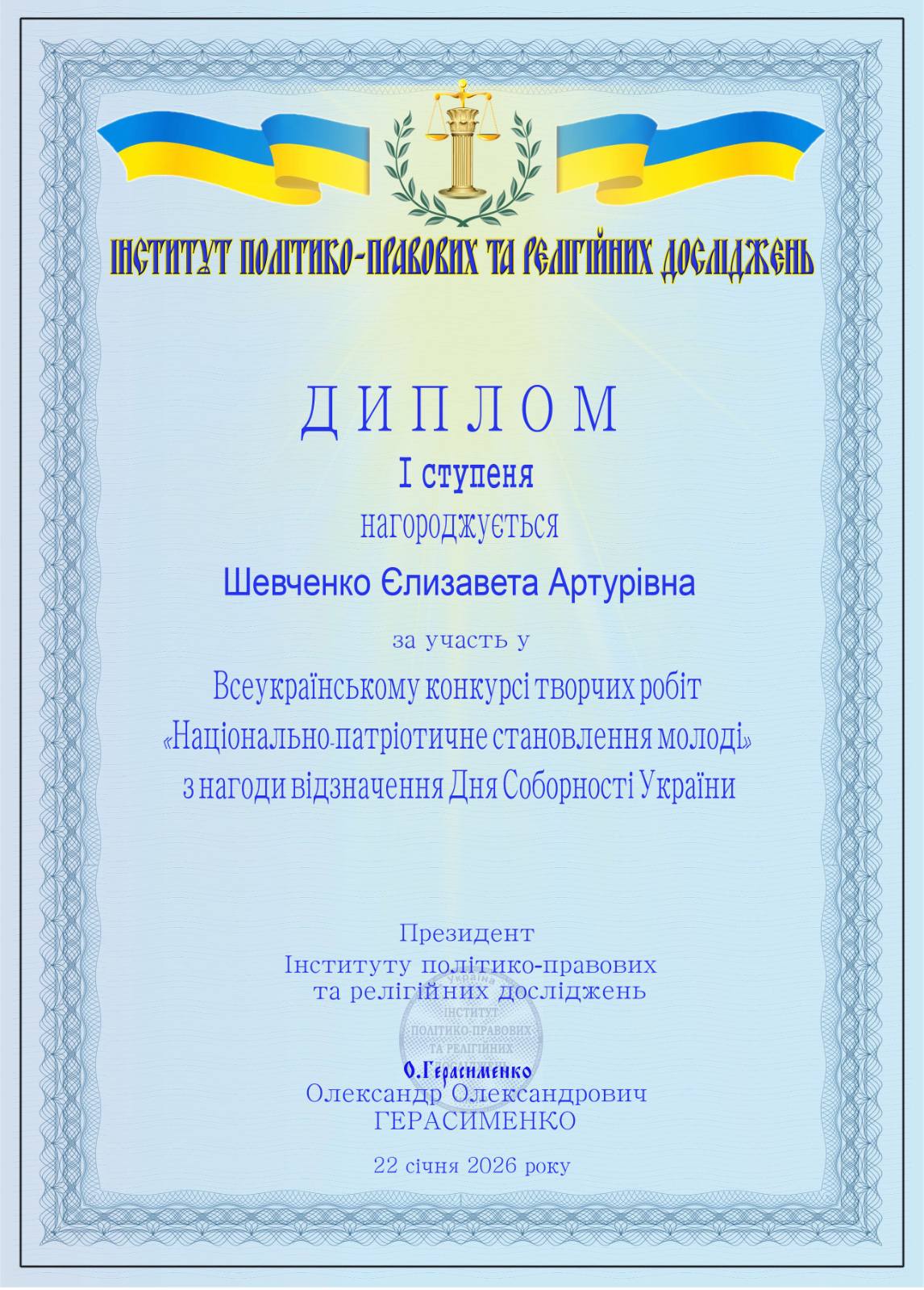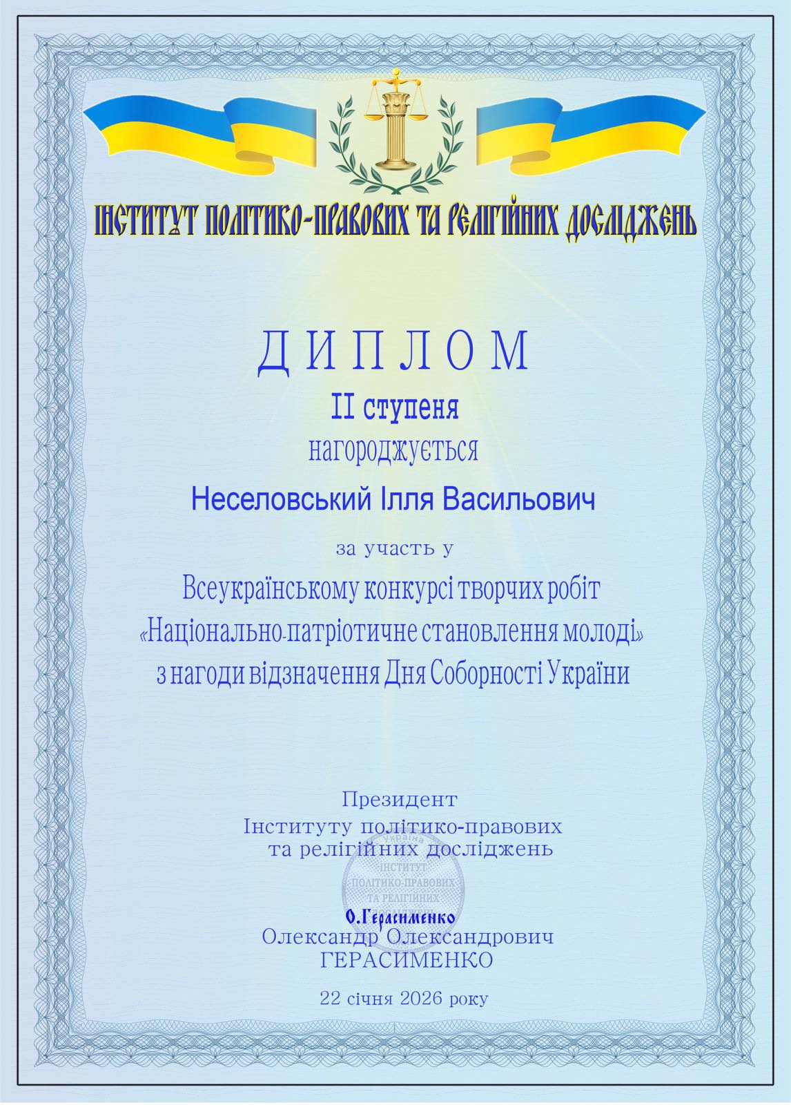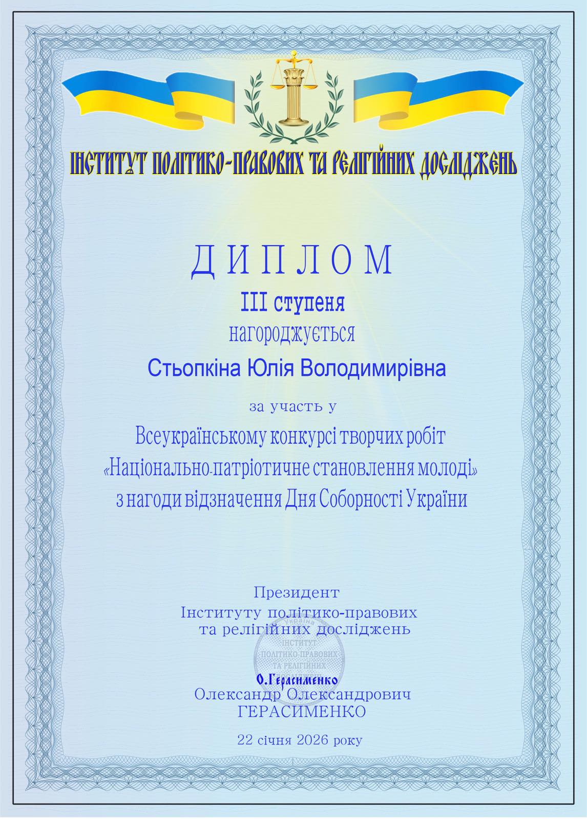 До Дня Соборності України підбито підсумки Всеукраїнського конкурсу «Національно-патріотичне становлення молоді», організованого Інститутом політико-правових та релігійних досліджень. У конкурсі взяли участь 25 368 конкурсантів з усієї України, що є переконливим свідченням його високого рівня, суспільної значущості та всеукраїнського масштабу. Приємно відзначити, що студенти нашого коледжу спеціальності 076 Підприємництво та торгівля освітньо-професійної програми Інформаційна діяльність підприємства групи ІДП-16 (викладач Мисюра Т.В.) гідно представили навчальний заклад і здобули призові місця, продемонструвавши активну громадянську позицію, національну свідомість і творчий потенціал: Шевченко Єлизавета Артурівна – диплом І ступеня; Неселовський Ілля Васильович – диплом ІІ ступеня; Стьопкіна Юлія Володимирівна – диплом ІІІ ступеня; Бондарчук Вікторія Сергіївна – диплом ІІІ ступеня. Організатори конкурсу також відзначили ВСП«Житомирський торговельно-економічний фаховий коледж ДТЕУ» подякою за системну роботу з формування громадянської свідомості, підтримку студентських наукових ініціатив та розвиток національно-патріотичних цінностей у молодіжному середовищі. Щиро вітаємо наших студентів з вагомими досягненнями! Бажаємо подальших успіхів, нових перемог і натхнення!