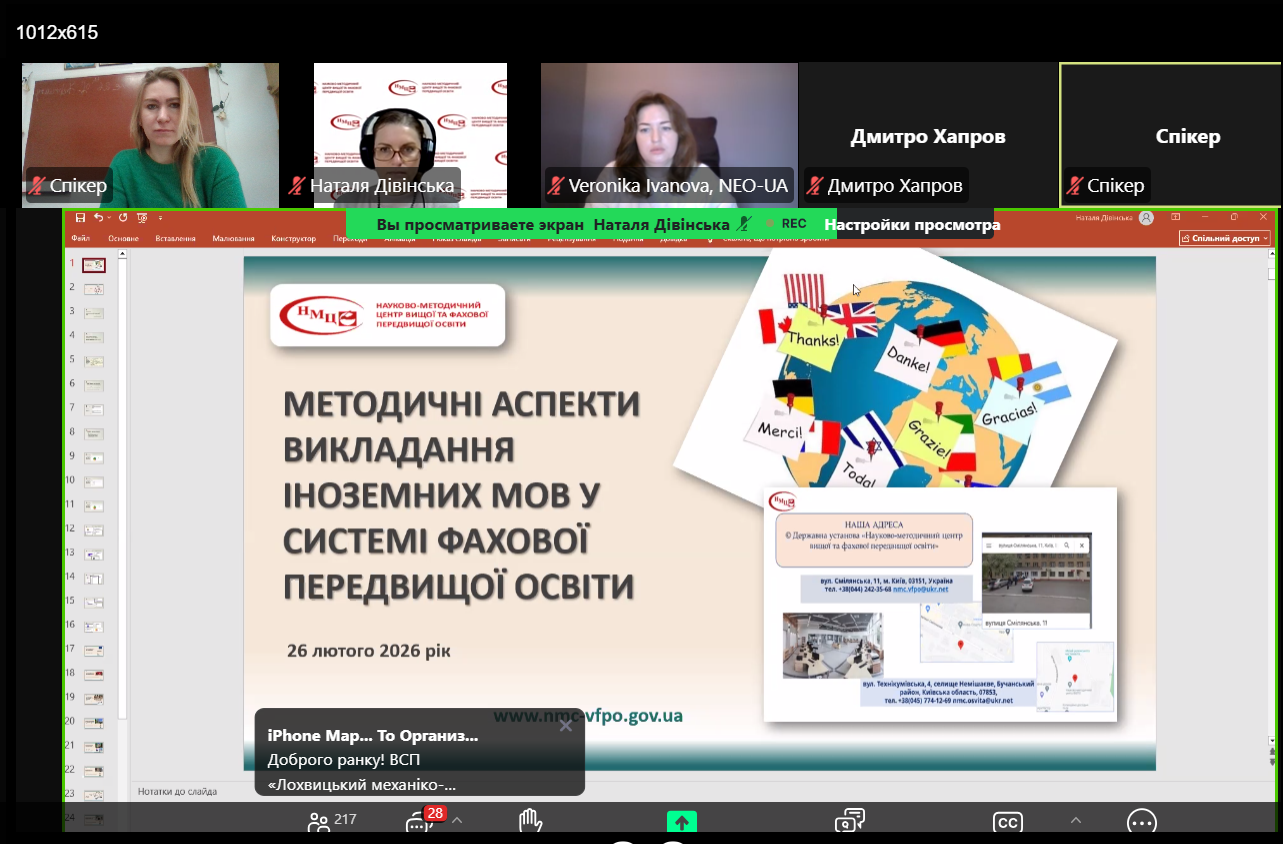 26 лютого 2026 року відбувся онлайн-семінар на тему «Методичні аспекти викладання іноземних мов у системі фахової передвищої освіти», організований Науково-методичним центром вищої та фахової передвищої освіти. Семінар є частиною реалізації Стратегічного плану МОН до 2027 року та пілотного проєкту щодо вивчення іноземної мови за професійним спрямування.