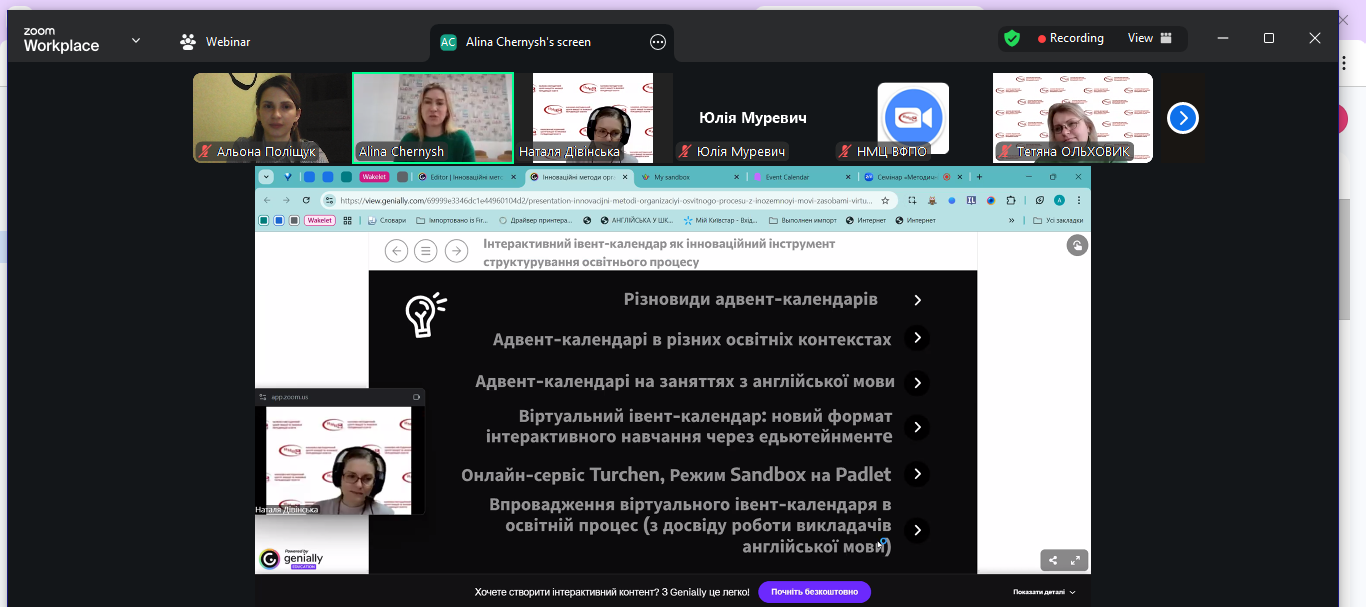 Як переможниці «Педагогічного ОСКАРУ-2025» до заходу також долучилися Альона ПОЛІЩУК та Аліна ЧЕРНИШ. Спікерки виступили з темою «Інноваційні методи організації освітнього процесу з іноземної мови засобами віртуального івент-календаря та освіт-хабу “Educational Laboratory”». Викладачки поділилися секретами використання віртуального івент-календаря — для чіткої структури освітнього процесу та освіт-хабу «Educational Laboratory» — як сучасного простору для взаємодії зі студентами. Понад 200 учасників з зіних міст України взяли участь у методичному семінарі.