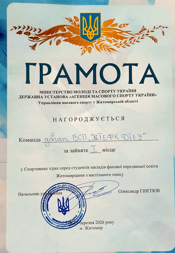18-19.03.2026 року за підтримки адміністрації та незалежної профспілки в межах тижня циклової комісії фізичного виховання, охорони праці та захисту України на базі ВСП «ЖТЕФК ДТЕУ» пройшли змагання зі «Спортивних ігор серед студентів ЗФПО Житомирщини» з настільного тенісу. Особливого статусу заходу додала присутність почесних гостей: начальник студентського відділу управління масового спорту Людмила Гедзюк, головний фахівець управління масового спорту Людмила Церпінська. Крім командного заліку, відбулися також змагання в індивідуальній першості, де в напруженій боротьбі студентка групи ПД-1, Марта Кучер здобула ІІ місце, продемонструвавши високу майстерність та волю до перемоги. За результатами запеклої боротьби трійки призерів виглядають наступним чином: